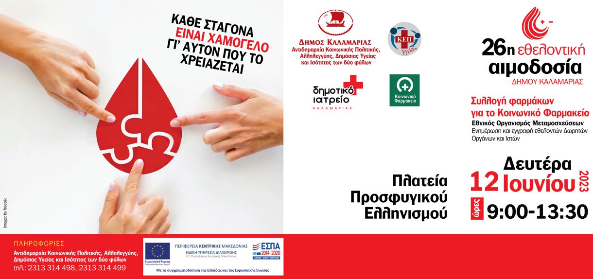 Η Αντιδημαρχία Κοινωνικής Πολιτικής, Αλληλεγγύης, Δημόσιας Υγείας και Ισότητας των Δύο Φύλων, σε συνεργασία με το Νοσοκομείο «ΑΧΕΠΑ», διοργανώνει την 26 η Εθελοντική Αιμοδοσία, τη Δευτέρα 12/06/2023, από 9:00 έως 13:30, στην Πλατεία Προσφυγικού Ελληνισμού ( Πλατεία Δημαρχείου) με παράλληλη δράση τη συλλογή φαρμάκων για την ενίσχυση του Κοινωνικού Φαρμακείου.