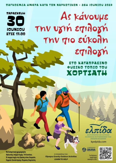 Στο πλαίσιο της Παγκόσμιας Ημέρας κατά των Ναρκωτικών, φέτος το Κέντρο Πρόληψης Ελπίδα καλεί τους κατοίκους της Ανατολικής Θεσσαλονίκης (Δήμους Καλαμαριάς, Θέρμης, Θερμαϊκού, Πυλαίας-Χορτιάτη) σε μία δράση στη φύση. Έχοντας σαν σύνθημα το «Ας κάνουμε την υγιή επιλογή την πιο εύκολη επιλογή» σας καλούμε σε μια απογευματινή πεζοπορική διαδρομή, μαζί με επαγγελματίες πιστοποιημένους συνοδούς από το Olympus Gravity-Outdoor Activities και πιστοποιημένους εκπαιδευτές πρώτων βοηθειών-διασωστών της LEARN TO HELP, στο καταπράσινο φυσικό τοπίο του Χορτιάτη! Θα ακολουθήσουμε μια πορεία σε απαράμιλλη φύση, με έντονη βλάστηση, που θα μας χαρίσει μια αίσθηση δροσιάς και αναζωογόνησης, στην καρδιά του καλοκαιριού. Τελικός προορισμός της διαδρομής μας θα είναι το καταφύγιο του Χορτιάτη, όπου θα έχουμε ελεύθερο χρόνο αλλά και δραστηριότητες για μεγάλους και μικρούς με θέμα, την πρόληψη των εξαρτήσεων.