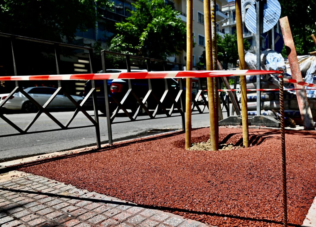 Το ίδιο υλικό χρησιμοποιήθηκε σε όλες τις δενδροδόχους της οδού Κρήτης, στο πλαίσιο των ολοκληρωμένων παρεμβάσεων, που επιχειρεί ο Δήμος Θεσσαλονίκης.