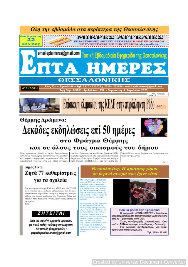 Αρχική ΕΠΤΑ ΗΜΕΡΕΣ ΠΡΩΤΟΣΕΛΙΔΑ Πρωτοσέλιδο Επτά Ημέρες 04/08/23 ΕΠΤΑ ΗΜΕΡΕΣ ΠΡΩΤΟΣΕΛΙΔΑΘΕΣΣΑΛΟΝΙΚΗ Πρωτοσέλιδο Επτά Ημέρες 04/08/23 Από ΜΑΡΙΑ ΓΙΑΝΝΕΛΟΥ - 7 Αυγούστου 2023 133 0 FacebookTwitterPinterestWhatsApp