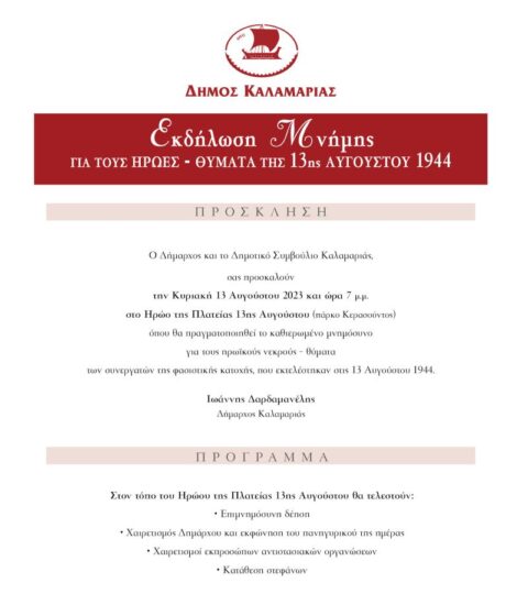 Με αφορμή τη συμπλήρωση 79 χρόνων από την εκτέλεση 25 Καλαμαριωτών σε μπλόκο των Γερμανών κατακτητών, ο Δήμος Καλαμαριάς, διοργανώνει εκδήλωση τιμής και μνήμης την Κυριακή 13 Αυγούστου 2023 και ώρα 7:00μ.μ στο Ηρώο της Πλατείας 13ης Αυγούστου (πάρκο Κερασούντος). Εκεί θα τελεστεί επιμνημόσυνη δέηση, παρουσία του Δημάρχου Καλαμαριάς, Γιάννη Δαρδαμανέλη και στη συνέχεια θα γίνει κατάθεση στεφάνων.