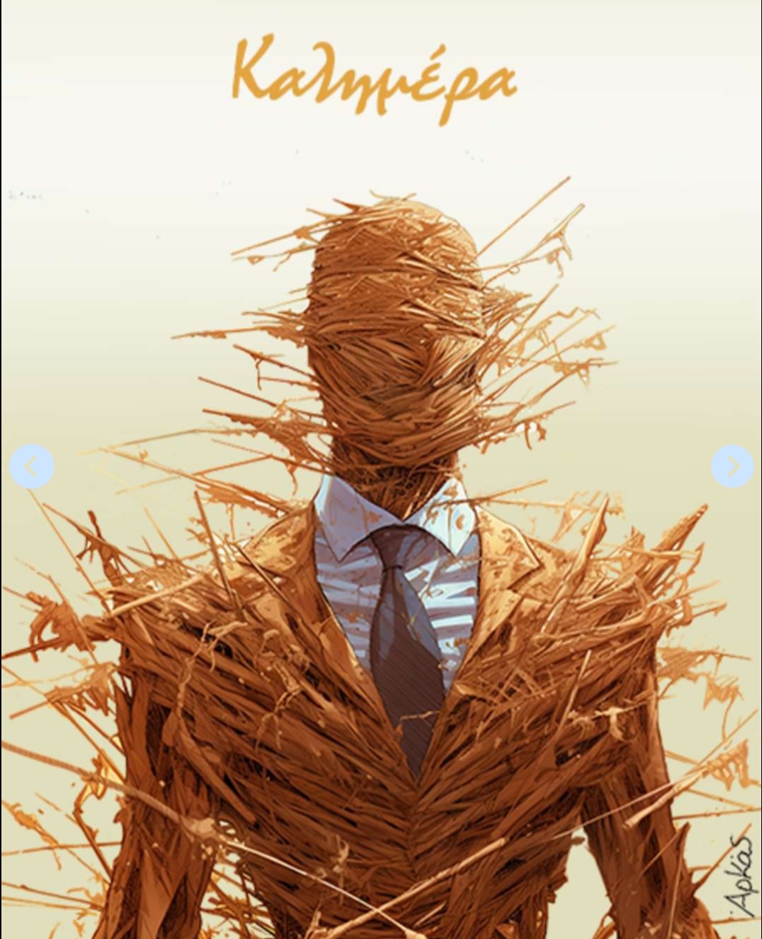 Αρχική ΚΟΙΝΩΝΙΑ Το ανατρεπτικό σκίτσο του Αρκά, για την πολιτική κατάσταση της χώρας ΚΟΙΝΩΝΙΑΤΕΛΕΥΤΑΙΑ ΝΕΑ Το ανατρεπτικό σκίτσο του Αρκά, για την πολιτική κατάσταση της χώρας Από ΜΑΡΙΑ ΓΙΑΝΝΕΛΟΥ - 1 Σεπτεμβρίου 2023 251 0 FacebookTwitterPinterestWhatsApp Μια φιγούρα που θυμίζει σκιάχτρο, με τη σοβαροφάνεια της γραβάτας. Και κατά τα άλλα, καλυμμένο με στάχυα ή αλλιώς, ξερά χόρτα…