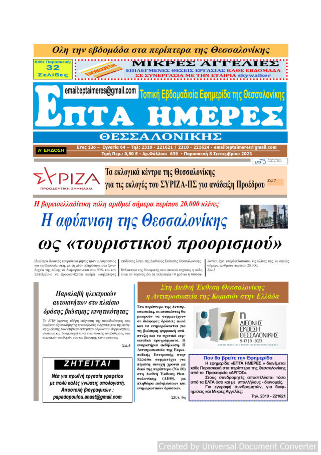 Αρχική ΕΠΤΑ ΗΜΕΡΕΣ ΠΡΩΤΟΣΕΛΙΔΑ Πρωτοσέλιδο Επτά Ημέρες 08/09/23 ΕΠΤΑ ΗΜΕΡΕΣ ΠΡΩΤΟΣΕΛΙΔΑΘΕΣΣΑΛΟΝΙΚΗ Πρωτοσέλιδο Επτά Ημέρες 08/09/23 Από ΜΑΡΙΑ ΓΙΑΝΝΕΛΟΥ - 12 Σεπτεμβρίου 2023 66 0 FacebookTwitterPinterestWhatsApp