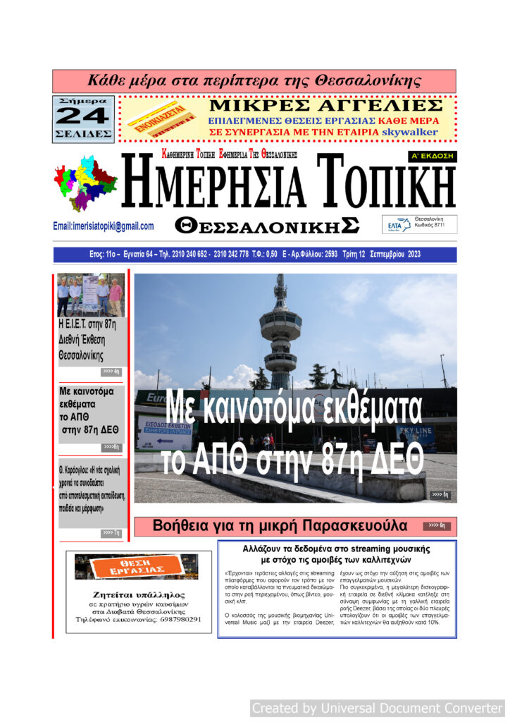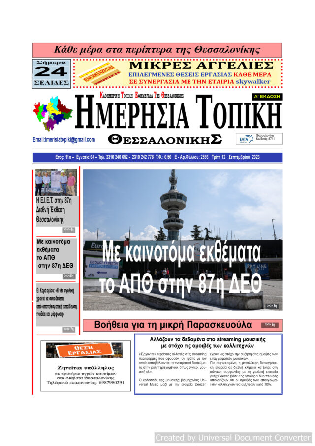 Αρχική ΘΕΣΣΑΛΟΝΙΚΗ Πρωτοσέλιδο Ημερήσια Τοπική 12/09/23 ΘΕΣΣΑΛΟΝΙΚΗΤΟΠΙΚΗ ΠΡΩΤΟΣΕΛΙΔΑ Πρωτοσέλιδο Ημερήσια Τοπική 12/09/23 Από ΜΑΡΙΑ ΓΙΑΝΝΕΛΟΥ - 12 Σεπτεμβρίου 2023 100 0 FacebookTwitterPinterestWhatsApp