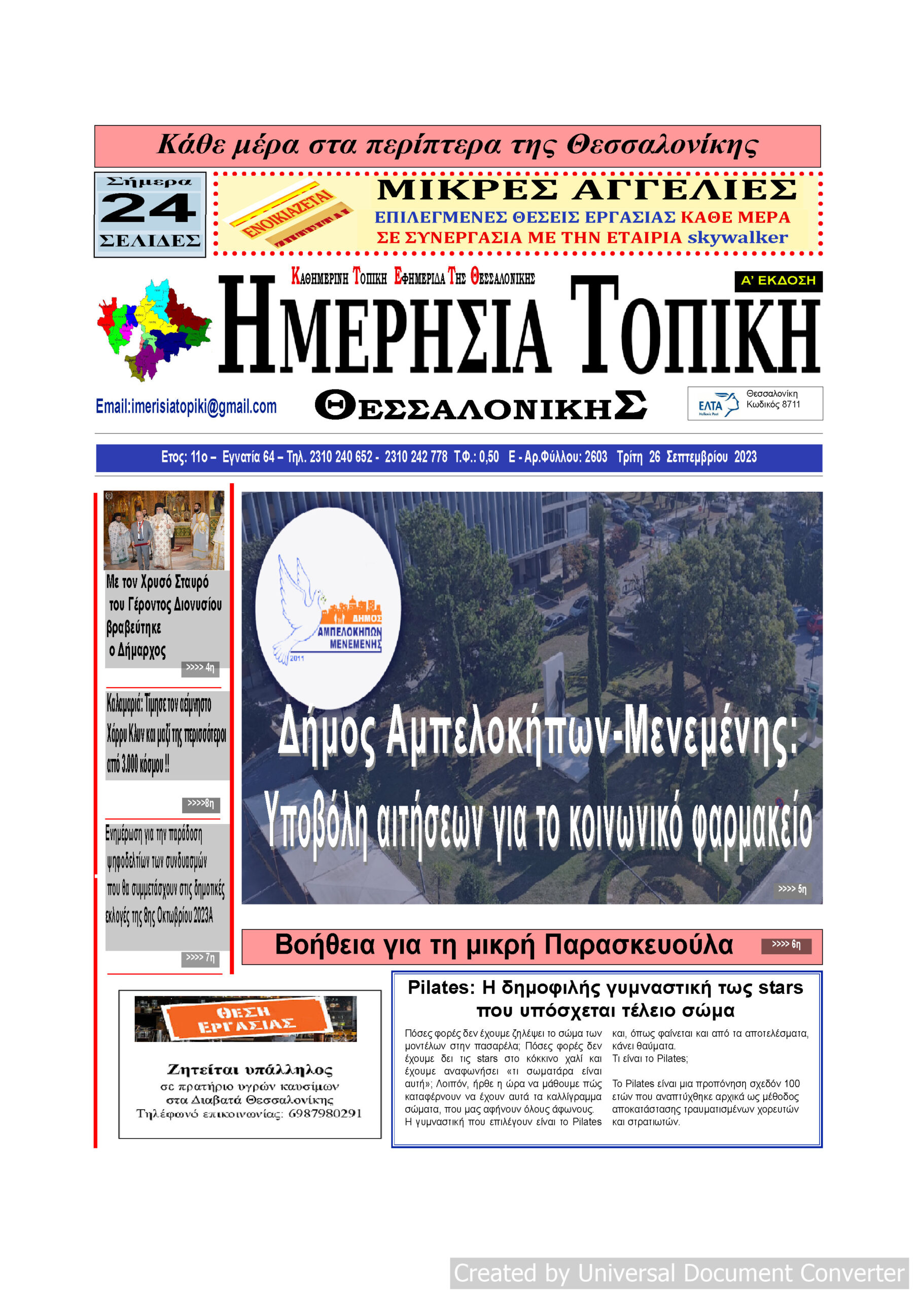 Αρχική ΘΕΣΣΑΛΟΝΙΚΗ Πρωτοσέλιδο Ημερήσια Τοπική 26/09/23 ΘΕΣΣΑΛΟΝΙΚΗΤΟΠΙΚΗ ΠΡΩΤΟΣΕΛΙΔΑ Πρωτοσέλιδο Ημερήσια Τοπική 26/09/23 Από ΜΑΡΙΑ ΓΙΑΝΝΕΛΟΥ - 2 Οκτωβρίου 2023 89 0 FacebookTwitterPinterestWhatsApp