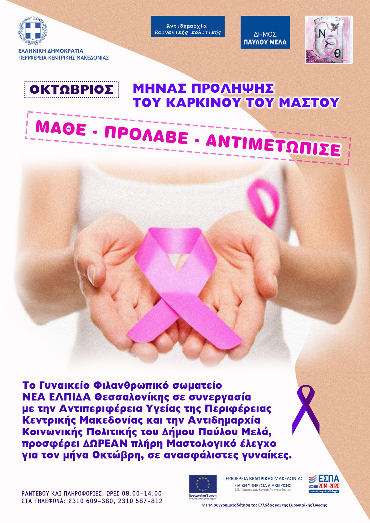 Η Αντιδημαρχία Κοινωνικής Πολιτικής του Δήμου Παύλου Μελά σε συνεργασία με την Αντιπεριφέρεια Υγείας της Περιφέρειας Κεντρικής Μακεδονίας και το Γυναικείο Φιλανθρωπικό Σωματείο «Νέα Ελπίδα Θεσσαλονίκης» διοργανώνουν, δωρεάν δράση πλήρους μαστολογικού ελέγχου σε γυναίκες ανασφάλιστες, με περιορισμένους οικονομικούς πόρους.