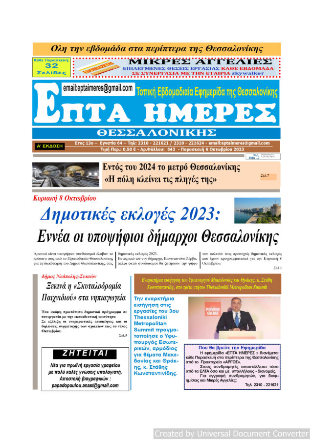 Αρχική ΕΠΤΑ ΗΜΕΡΕΣ ΠΡΩΤΟΣΕΛΙΔΑ Πρωτοσέλιδο Επτά Ημέρες 06/10/23 ΕΠΤΑ ΗΜΕΡΕΣ ΠΡΩΤΟΣΕΛΙΔΑΘΕΣΣΑΛΟΝΙΚΗ Πρωτοσέλιδο Επτά Ημέρες 06/10/23 Από ΜΑΡΙΑ ΓΙΑΝΝΕΛΟΥ - 6 Οκτωβρίου 2023 113 0 FacebookTwitterPinterestWhatsApp