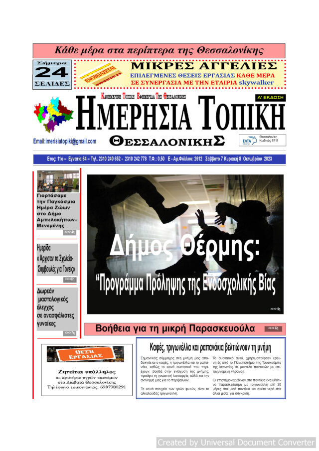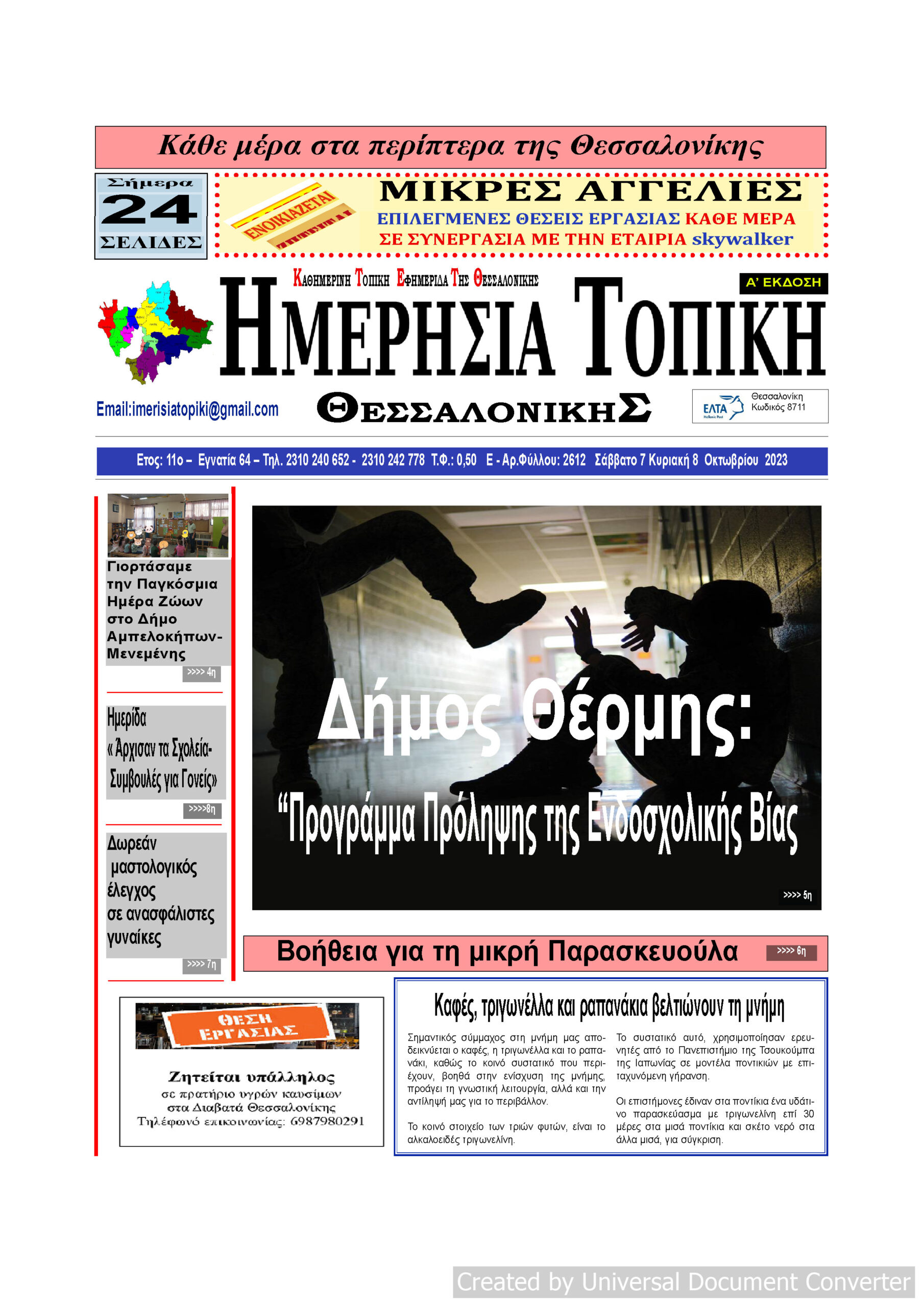 Αρχική ΘΕΣΣΑΛΟΝΙΚΗ Πρωτοσέλιδο Ημερήσια Τοπική 07/10/23 – 08/10/23 ΘΕΣΣΑΛΟΝΙΚΗΤΟΠΙΚΗ ΠΡΩΤΟΣΕΛΙΔΑ Πρωτοσέλιδο Ημερήσια Τοπική 07/10/23 – 08/10/23 Από ΜΑΡΙΑ ΓΙΑΝΝΕΛΟΥ - 7 Οκτωβρίου 2023 88 0 FacebookTwitterPinterestWhatsApp