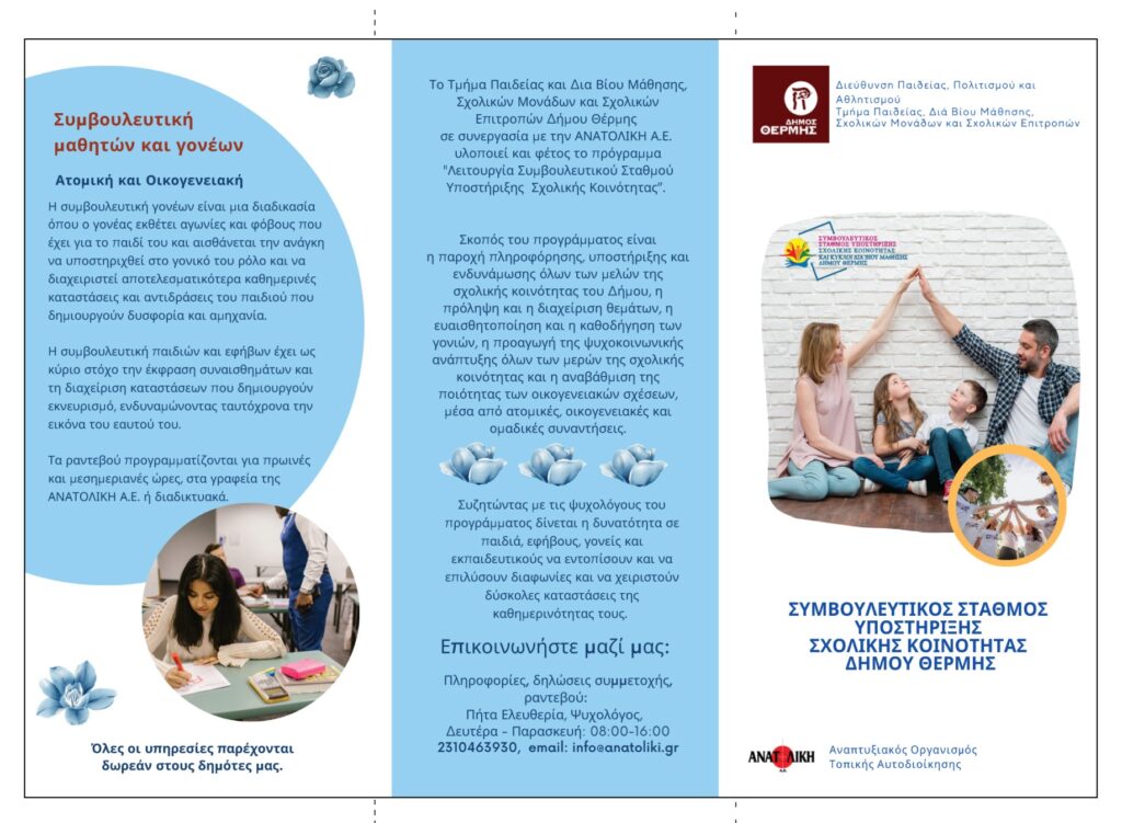 Η Διεύθυνση Παιδείας, Πολιτισμού και Αθλητισμού του Δήμου Θέρμης και ειδικότερα το Τμήμα Παιδείας, Διά Βίου Μάθησης, Σχολικών Μονάδων και Σχολικών Επιτροπών, σε συνεργασία με την ΑΝΑΤΟΛΙΚΗ Α.Ε. συνεχίζουν τη λειτουργία του Συμβουλευτικού Σταθμού Υποστήριξης των μελών της Σχολικής Κοινότητας του Δήμου. Μάλιστα προστίθενται οι «Κύκλοι Διά Βίου Μάθησης», ώστε η υποστήριξη και ενδυνάμωση να επεκτείνεται πέρα από γονείς, μαθητές και εκπαιδευτικούς και σε περισσότερα μέλη της τοπικής κοινωνίας του Δήμου Θέρμης με προτεραιότητα στα μέλη του Συμβουλίου Νέων και στα στελέχη του Ανθρώπινου δυναμικού του Δήμου.