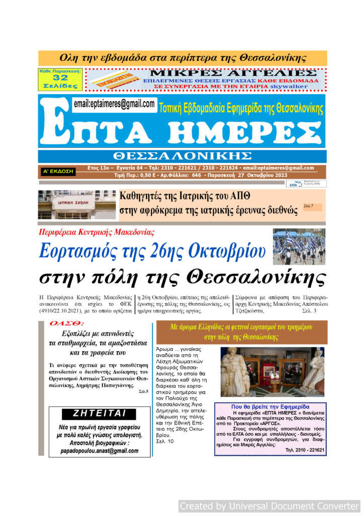 Αρχική ΕΠΤΑ ΗΜΕΡΕΣ ΠΡΩΤΟΣΕΛΙΔΑ Πρωτοσέλιδο Επτά Ημέρες 27/10/23 ΕΠΤΑ ΗΜΕΡΕΣ ΠΡΩΤΟΣΕΛΙΔΑΘΕΣΣΑΛΟΝΙΚΗ Πρωτοσέλιδο Επτά Ημέρες 27/10/23 Από ΜΑΡΙΑ ΓΙΑΝΝΕΛΟΥ - 30 Οκτωβρίου 2023 189 0 FacebookTwitterPinterestWhatsApp