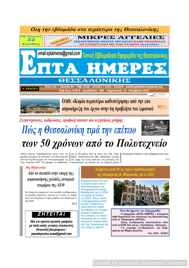 Αρχική ΕΠΤΑ ΗΜΕΡΕΣ ΠΡΩΤΟΣΕΛΙΔΑ Πρωτοσέλιδο Επτά Ημέρες 17/11/23 ΕΠΤΑ ΗΜΕΡΕΣ ΠΡΩΤΟΣΕΛΙΔΑΘΕΣΣΑΛΟΝΙΚΗ Πρωτοσέλιδο Επτά Ημέρες 17/11/23 Από ΜΑΡΙΑ ΓΙΑΝΝΕΛΟΥ - 17 Νοεμβρίου 2023 232 0 FacebookTwitterPinterestWhatsApp