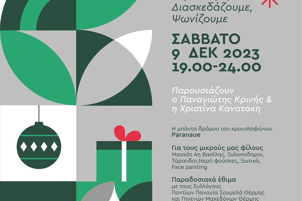 Παράλληλα, οι πρόσκοποι Θέρμης θα προσφέρουν ζεστή σοκολάτα και η Ένωση Επαγγελματιών Εμπόρων Δήμου Θέρμης, κάστανα και κρασί. Διασκέδαση – χορός – τραγούδια και αγορές από τα καταστήματα που θα κάνουν «ειδικές τιμές». Με τις αποδείξεις που θα συλλέγουν οι καταναλωτές, θα έρχονται στην πλατεία όπου και θα τις καταθέτουν ώστε να μπουν στην κλήρωση που θα πραγματοποιηθεί στις 23:00 προσφέροντας σε πέντε τυχερούς από ένα μπλοκ δωροεπιταγών αξίας 100€. Το ειδικά διαμορφωμένο ωράριο της αγοράς για το Σάββατο 9 Δεκεμβρίου 2023 θα είναι από τις 19:00 έως 24:00. Το πρόγραμμα των εκδηλώσεων θα παρουσιάσουν οι δημοσιογράφοι Χριστίνα Κανατάκη και Παναγιώτης Κρινής.