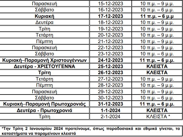 *Την προπαραμονή των Χριστουγέννων θα ανοίξουν στις 10 το πρωί και θα κλείσουν στις 6 το απόγευμα