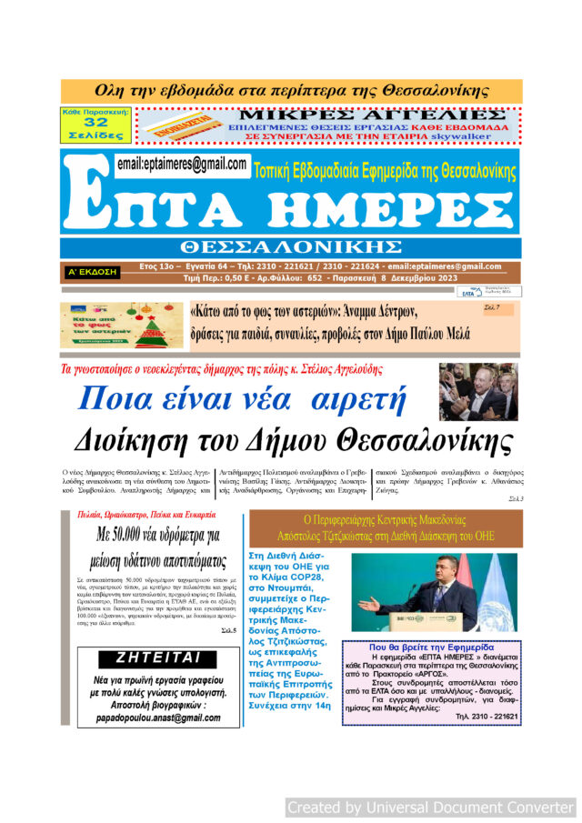 Αρχική ΕΠΤΑ ΗΜΕΡΕΣ ΠΡΩΤΟΣΕΛΙΔΑ Πρωτοσέλιδο Επτά Ημέρες 08/12/23 ΕΠΤΑ ΗΜΕΡΕΣ ΠΡΩΤΟΣΕΛΙΔΑΘΕΣΣΑΛΟΝΙΚΗ Πρωτοσέλιδο Επτά Ημέρες 08/12/23 Από ΜΑΡΙΑ ΓΙΑΝΝΕΛΟΥ - 8 Δεκεμβρίου 2023 204 0 FacebookTwitterPinterestWhatsApp